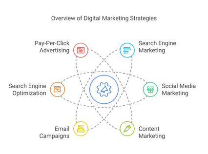 Digital marketing leverages the internet to connect with target audiences. It includes strategies such as: